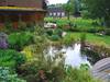 Hausgarten mit Gartenteich, Dachbegrünung, Holzdeck, Staudenpflanzung.